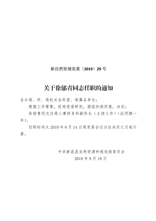 關(guān)于徐郁青同志任職的通知(新自然資規(guī)黨委〔2019〕29號(hào))