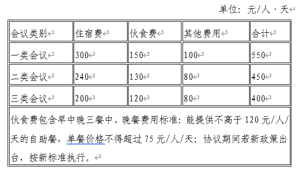 供應(yīng)商只能申請(qǐng)加入一個(gè)標(biāo)項(xiàng)的框架協(xié)議。 (四)最高限價(jià) 會(huì)議費(fèi)開支標(biāo)準(zhǔn)根據(jù)《紹興市財(cái)政局關(guān)于印發(fā)紹興市市級(jí)機(jī)關(guān)會(huì)議費(fèi)管理規(guī)定》(紹市財(cái)行〔2018〕2號(hào))、《紹興市財(cái)政局關(guān)于印發(fā)紹興市市級(jí)機(jī)關(guān)工作人員差旅費(fèi)管理規(guī)定的通知》(紹市財(cái)行〔2017〕7號(hào))等相關(guān)要求執(zhí)行。入圍供應(yīng)商在具體承接會(huì)議時(shí)人均會(huì)議費(fèi)不得超過以下標(biāo)準(zhǔn):