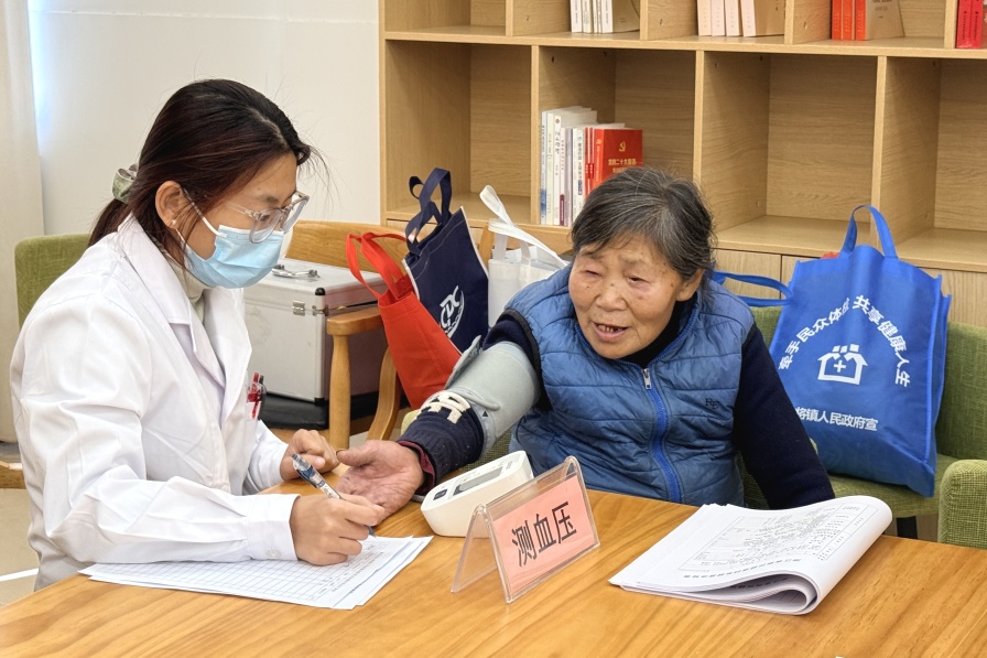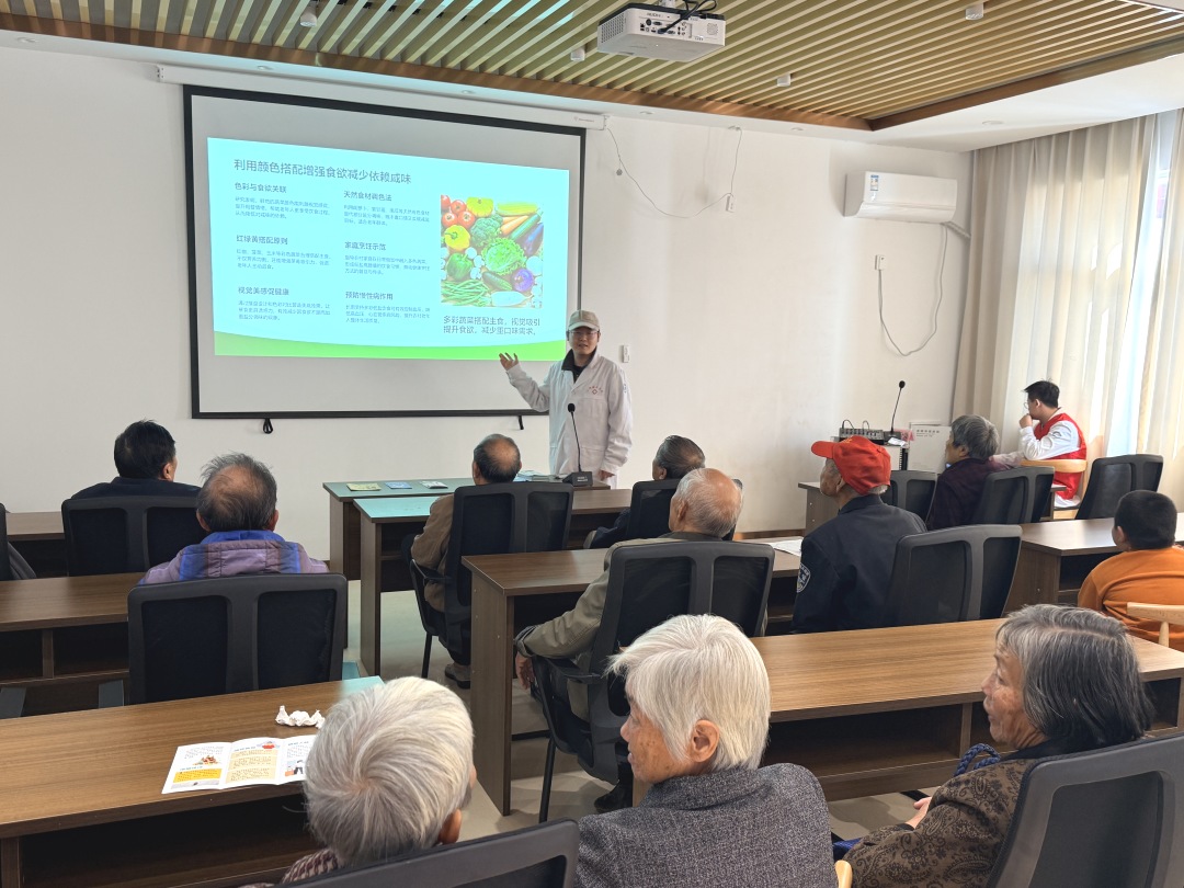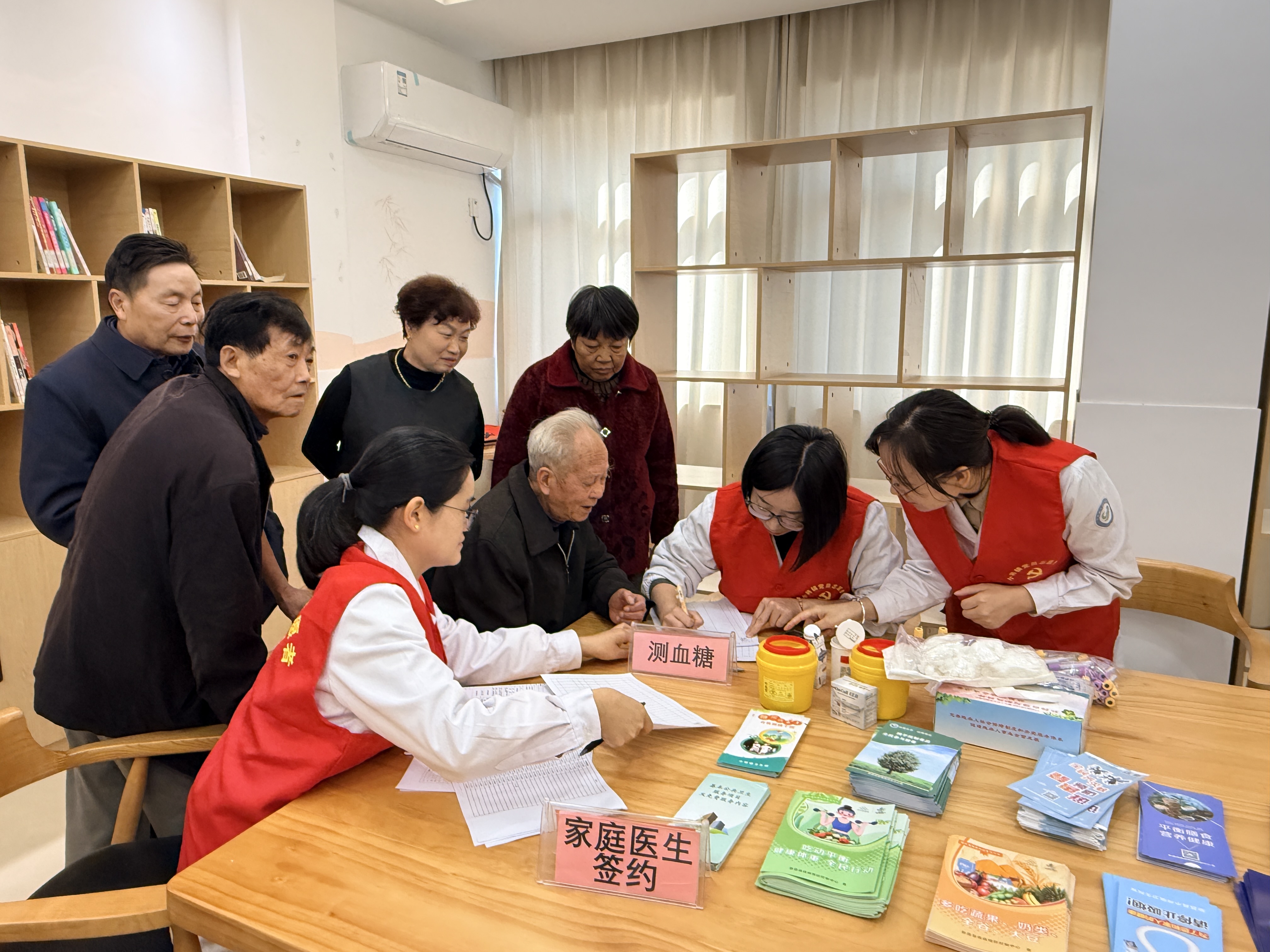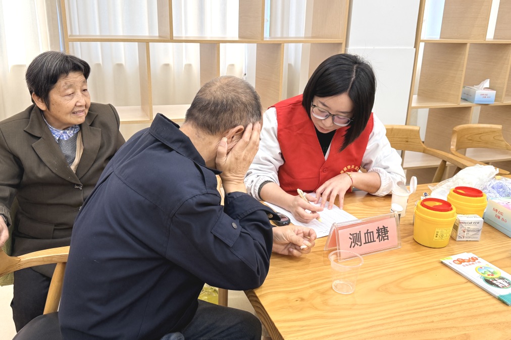衛生院志愿者開展健康養生知識講座,為老人免費測量血壓血糖,結合身體狀況給出合理的飲食、運動建議。