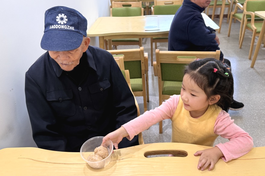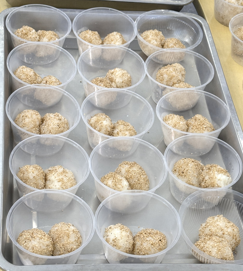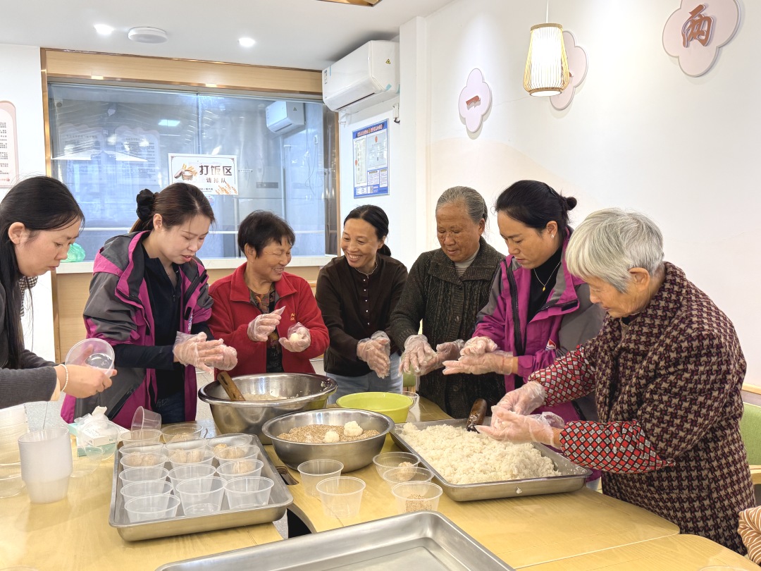 老人們與志愿者共同制作麻團,孩子們將甜蜜的麻團親手送給老人。