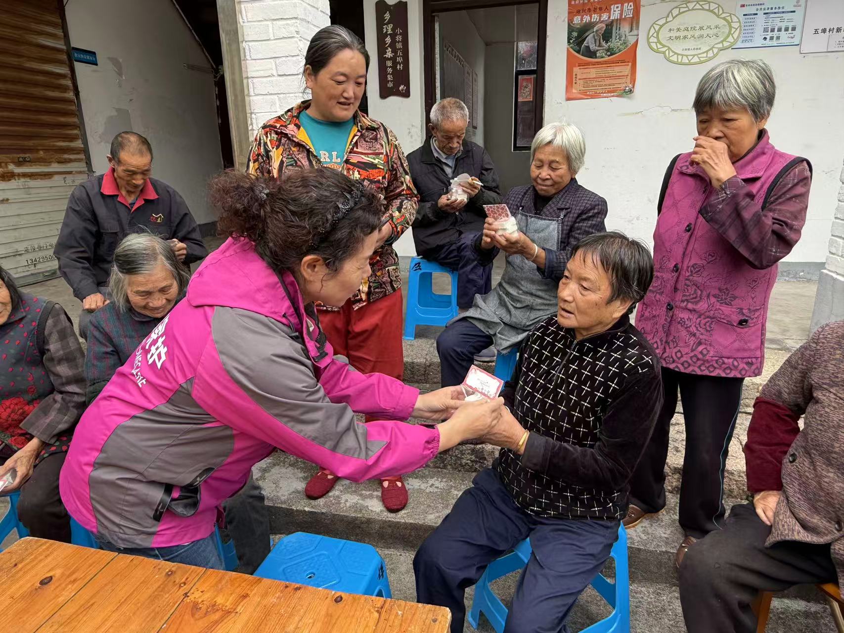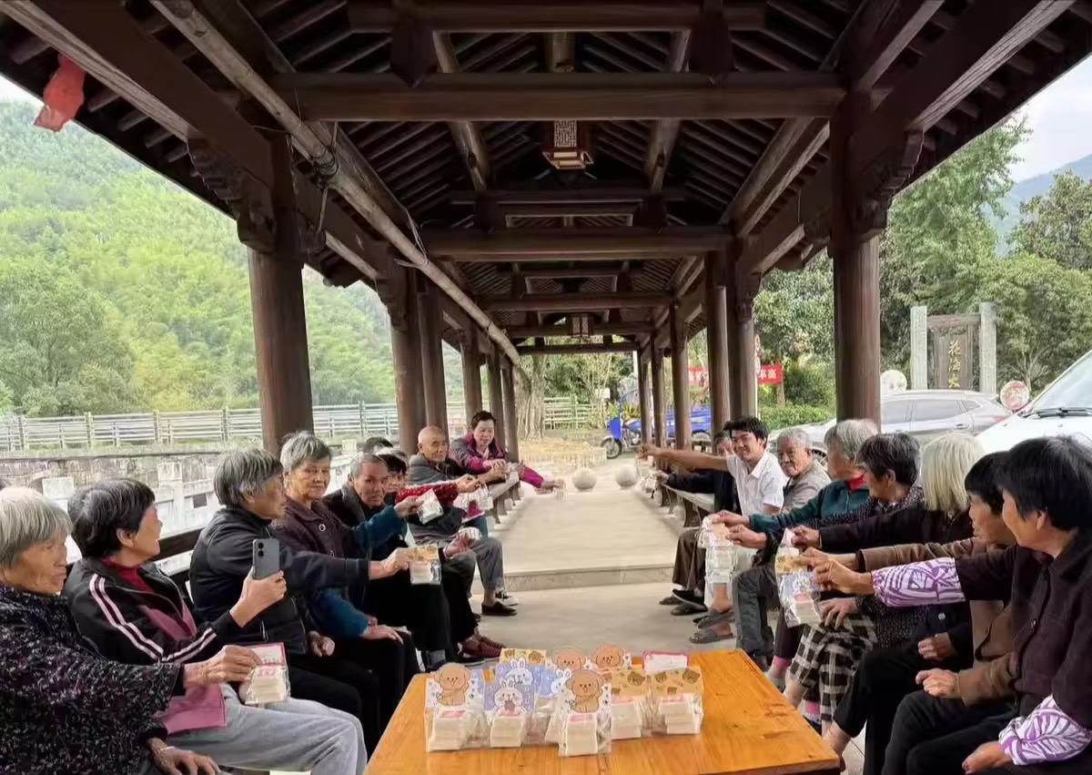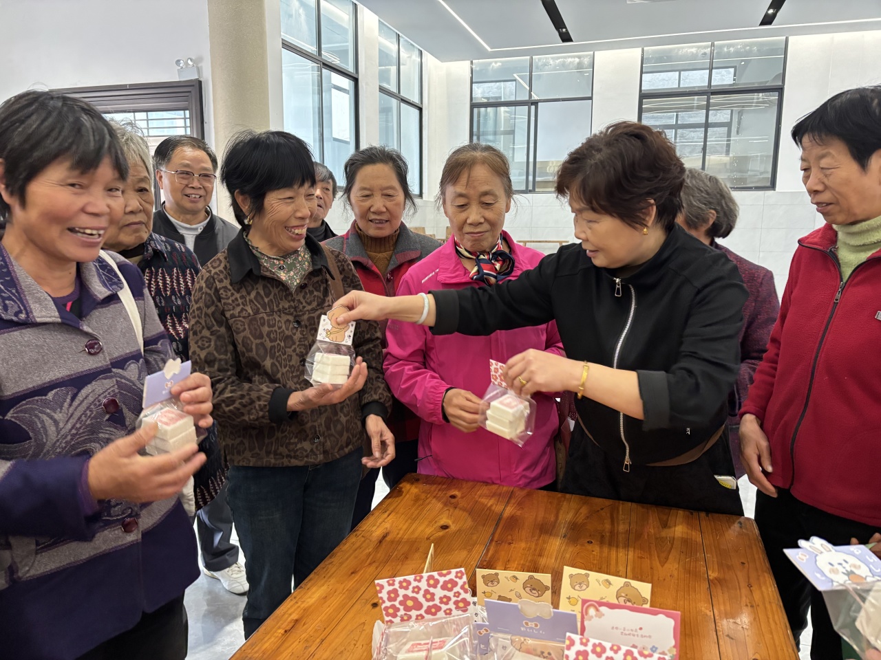 樂齡中心志愿者為村里老人送去長壽糕,蘊含著"步步登高、福壽綿長"的美好祝愿。
