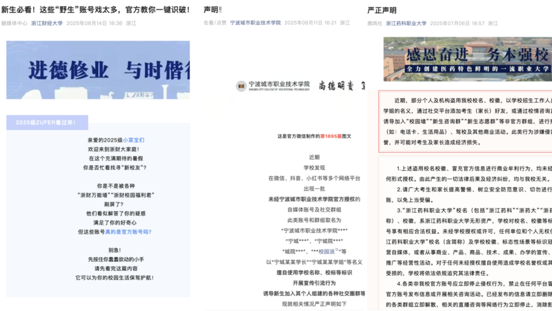 近段時間以來浙江多所高校發(fā)布聲明或提醒曝光一批非官方校園賬號及群組